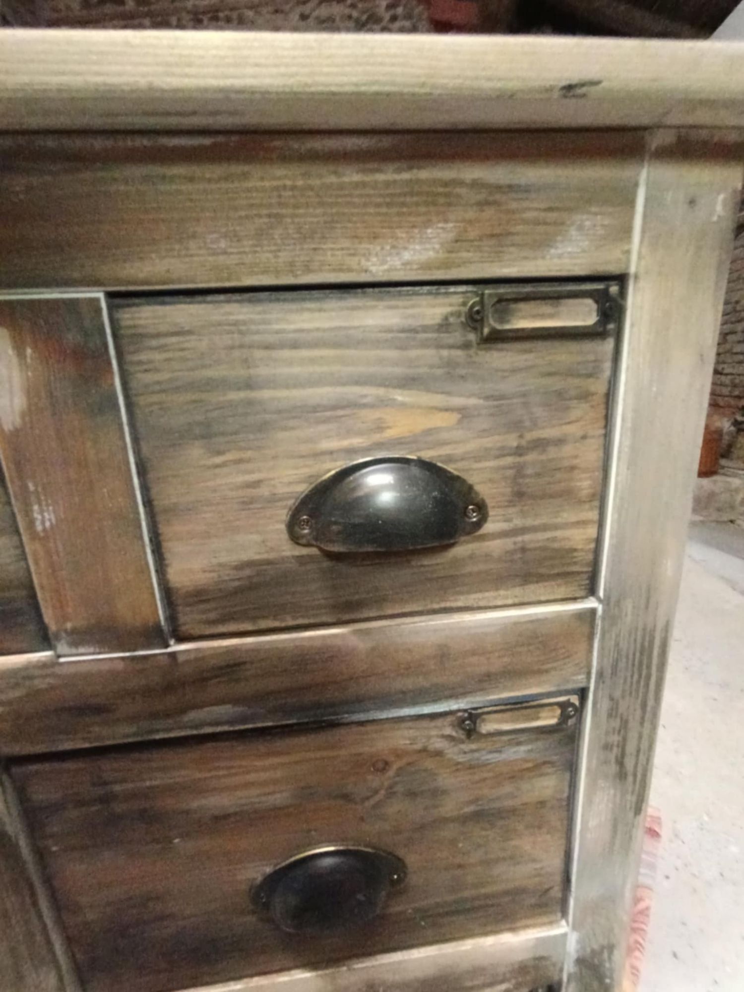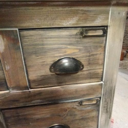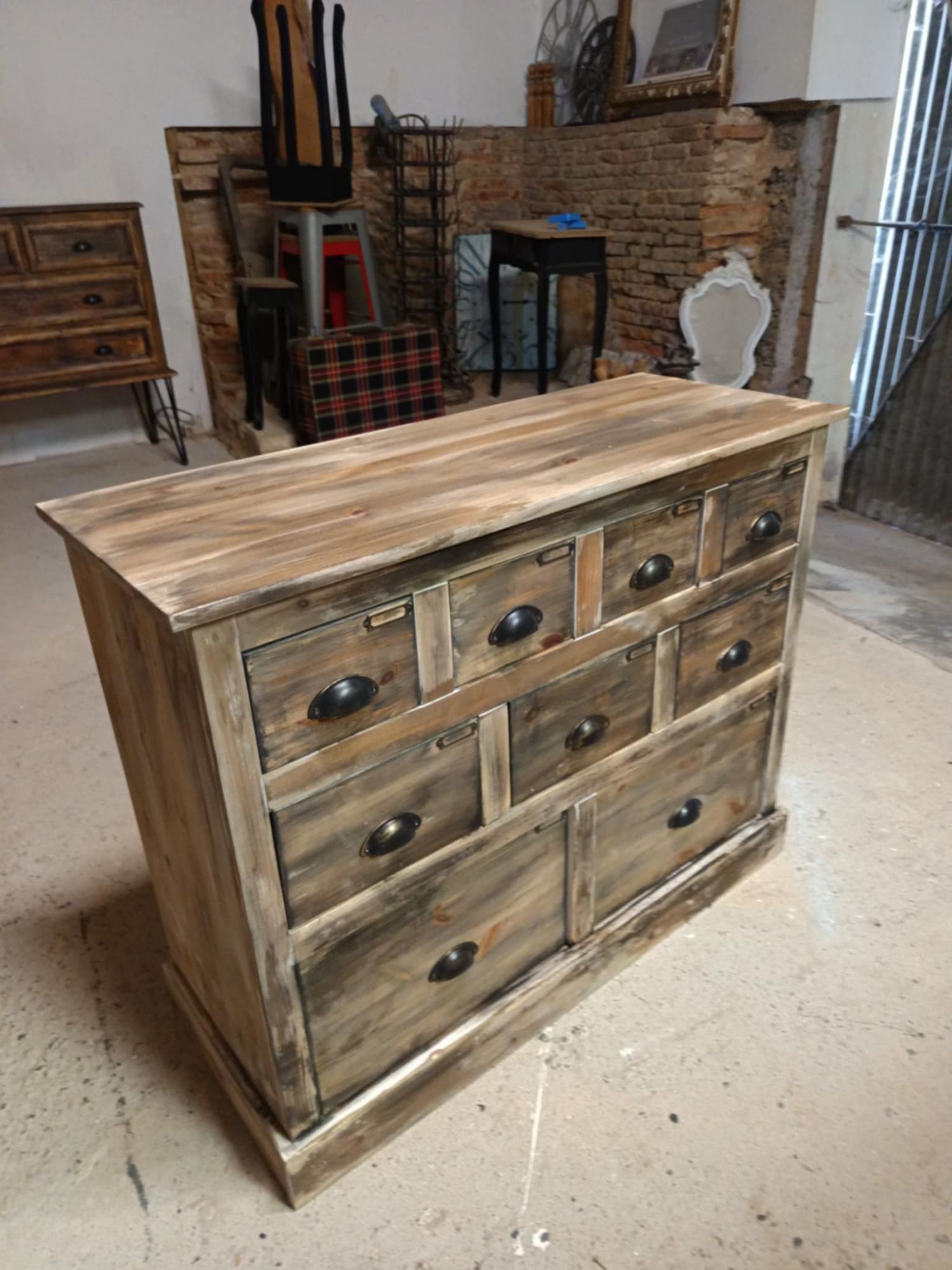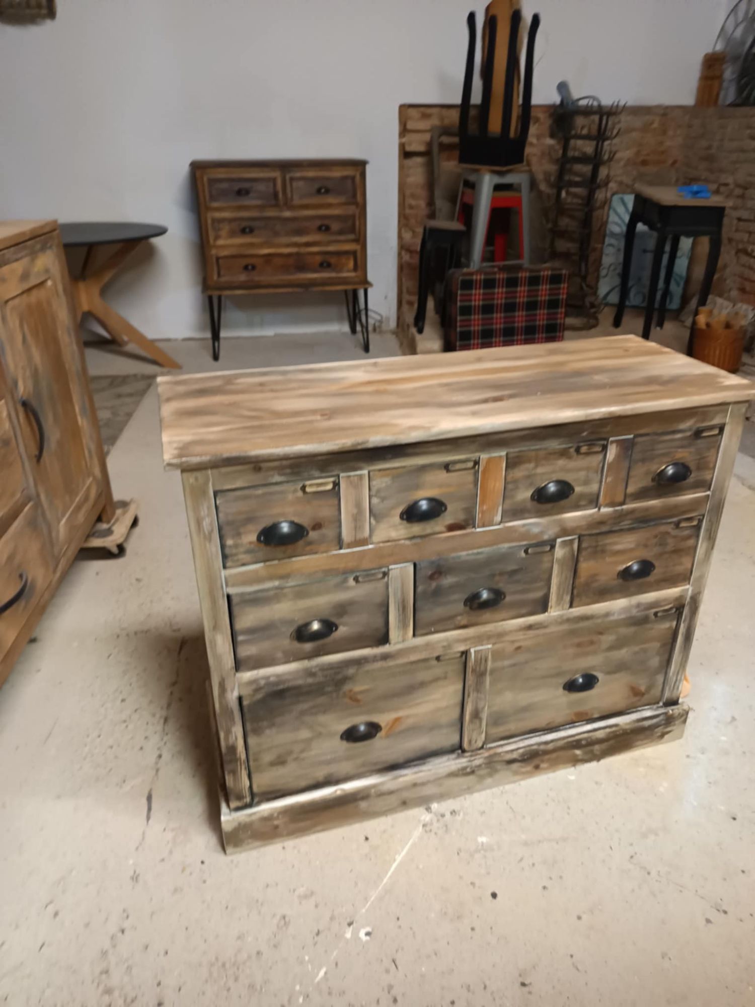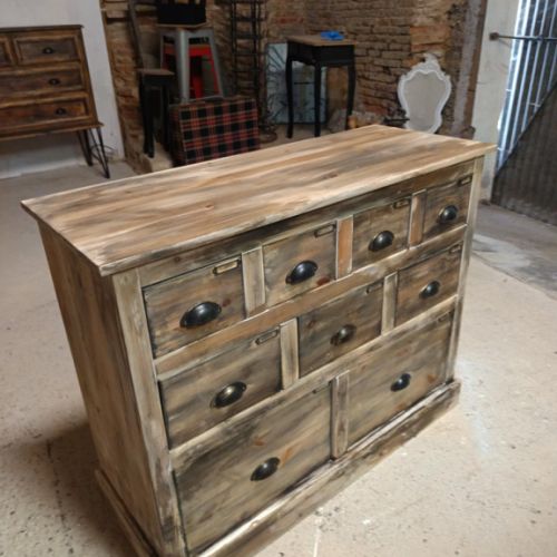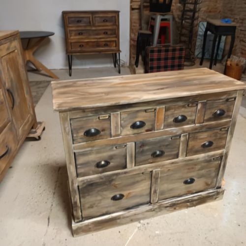 Meuble de métier, en pin, avec 9 tiroirs de différentes dimensions ornés de poignées "coquille", dans un esprit industriel chic.